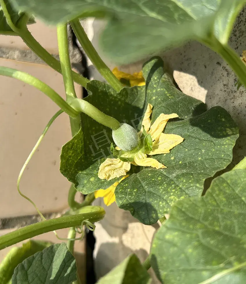 以下照片拍攝于8月29日下午3:42分,當時的氣溫30℃,最高氣溫31℃。離上次拍攝只有幾天時間,這個時候的甜瓜葉片變得綠油油的了,上次結(jié)的瓜也長大了,并且又結(jié)了不少小瓜(沒有進行人工授粉,也沒有使用“氯吡脲”,發(fā)現(xiàn)有螞蟻在幫助傳粉)。